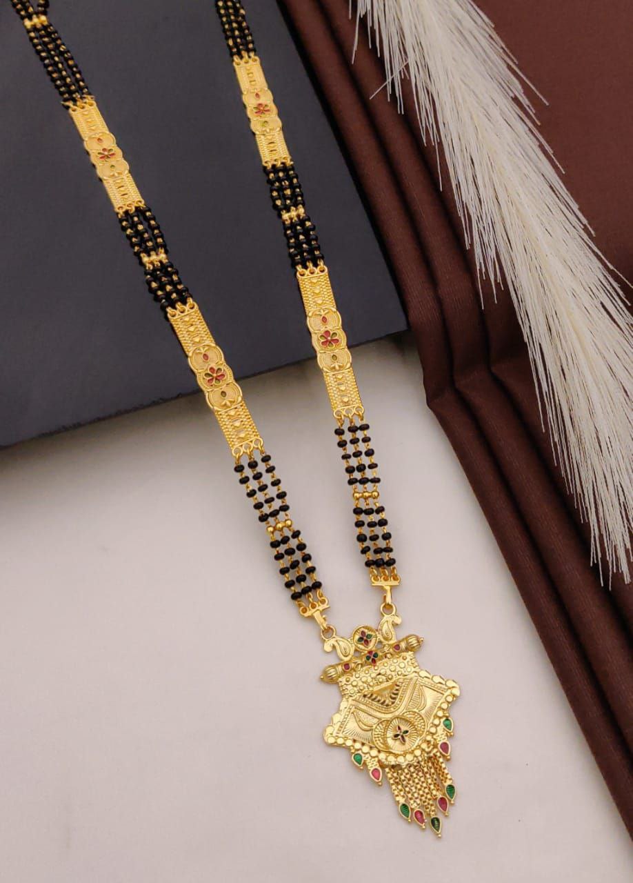 Embrace tradition with a touch of modern elegance with this Forming AD Diamond High Gold Plated 3-Line Mangalsutra. Designed to symbolize love and commitment, this exquisite piece features three delicate black bead chains, complemented by a beautifully crafted American Diamond (AD) studded pendant, all finished with high gold plating for a luxurious look.