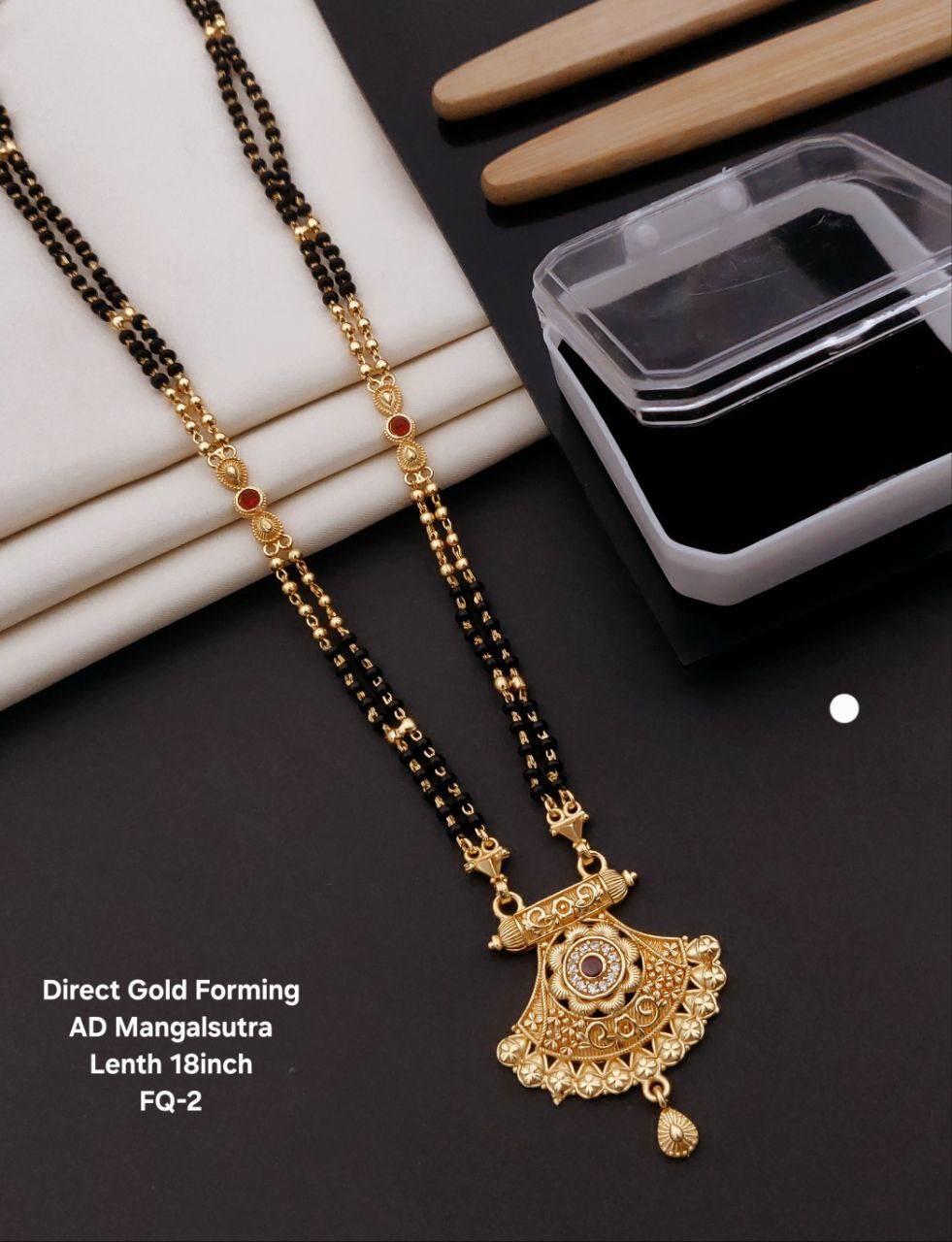 Embrace tradition with a touch of modern elegance with this Forming AD Diamond High Gold Plated 3-Line Mangalsutra. Designed to symbolize love and commitment, this exquisite piece features three delicate black bead chains, complemented by a beautifully crafted American Diamond (AD) studded pendant, all finished with high gold plating for a luxurious look.